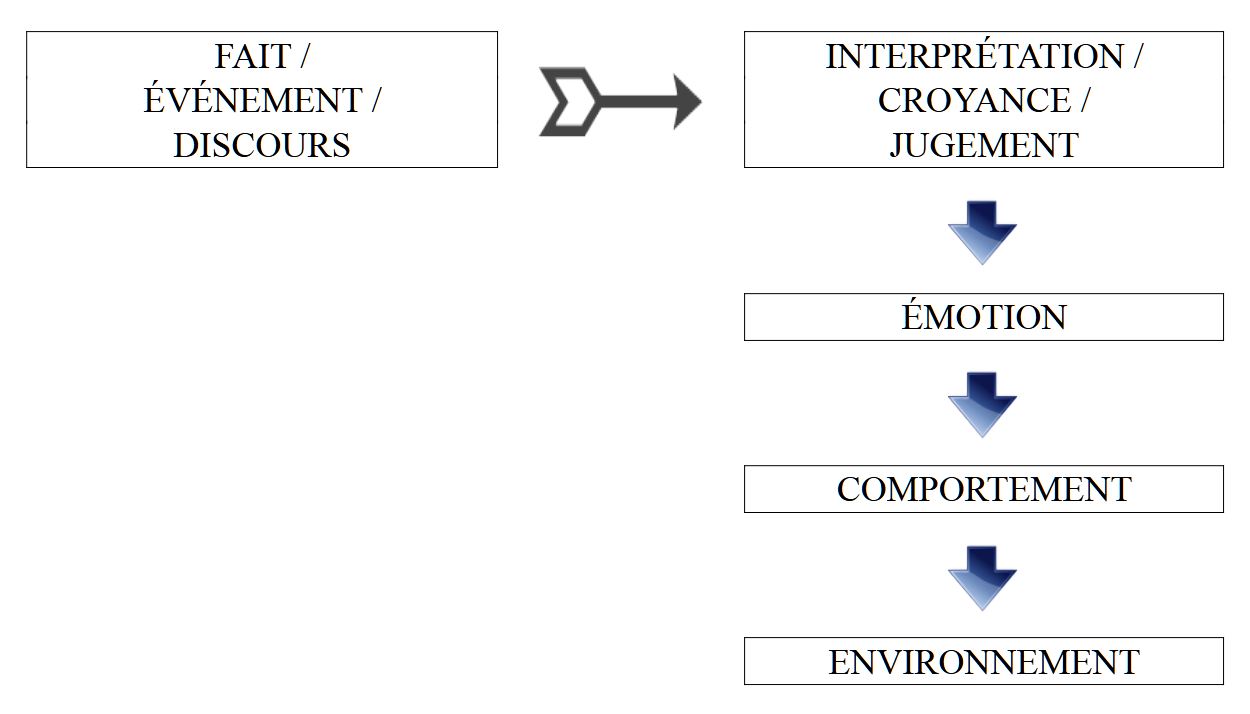Prenons comme exemple un tour de carte : le magicien fait choisir une carte, puis la devine. Le spectateur vit cette expérience comme un événement. Il va se forger une vision, une interprétation des faits. De cette vision il va en découler une croyance ( le magicien peut lire dans les pensées, il devine ce qui va se passer ). De cette croyance, le spectateur va avoir une émotion, un ressenti ( surpris, emballé, joyeux, ou au contraire, agacé, frustré de ne pas comprendre ). De cette émotion suivra son comportement ( il va parler pus rapidement, il va examiner les cartes, il peut rougir ) qui se reflétera dans son environnement ( il va faire rire son entourage, cela va vous faire plaisir, vous allez vouloir en faire un autre ).